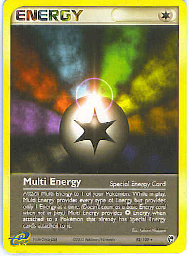 Attach Multi Energy to 1 of your Pokemon. While in play, Multi Energy provides every type of Energy but provides only 1 energy at a time. (Doesn't count as a basic Energy card when not in play.) Multi Energy provides C Energy when attached to a Pokemon that already has Special Energy cards attached to it.