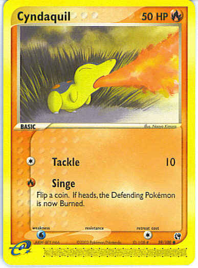 Type | Fire | Pokemon serie | Sandstorm | Stadie | Basic | HP | 50 | Sjældenhed | Common | Tilbagetrækning | 1 | Svaghed | W | Kortnummer | 59 | Evne | [C] Tackle (10) [R] Singe - Flip a coin. If heads, the Defending Pokemon is now Burned.