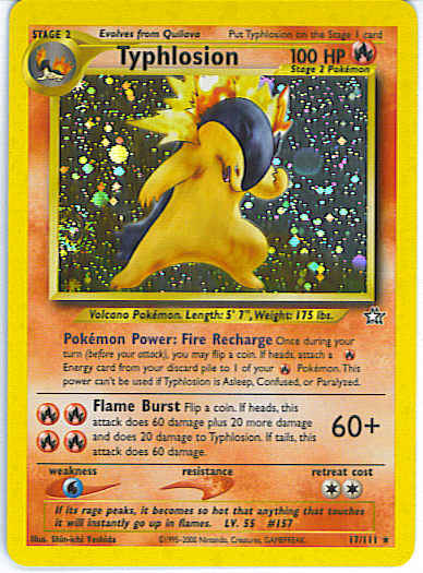 [RRRR] Flame Burst (60+) Flip a coin. If heads, this attack does 60 damage plus 20 more damage and does 20 damage to Typhlosion. If tails, this attack does 60 damage.