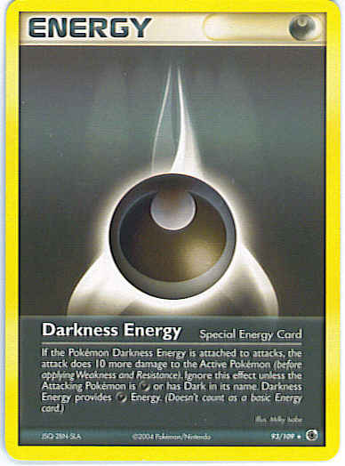 If the Pokemon Darkness Energy is attached to attacks, the attack does 10 more damage to the Active Pokemon (before applying Weakness and Resistance). Ignore this effect unless the Attacking Pokemon is D or has Dark in its name. Darkness Energy provides D energy. (Doesn't count as a basic Energy card.)