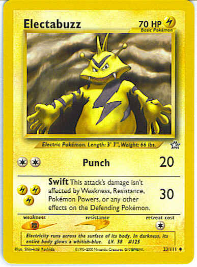 Type | Lightning | Pokemon serie | Neo Genesis | Stadie | Basic | HP | 70 | Sjældenhed | Uncommon | Tilbagetrækning | 1 | Svaghed | F | Kortnummer | 33 | Evne |