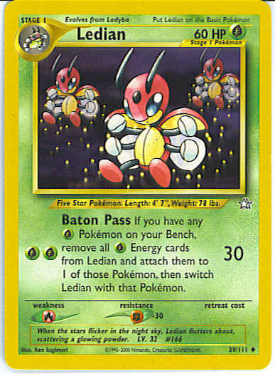 [GG] Baton Pass (30) If you have any G Pokemon on your Bench, remove all G Energy cards from Ledian and attach them to 1 of those Pokemon, then switch Ledian with that Pokemon.
