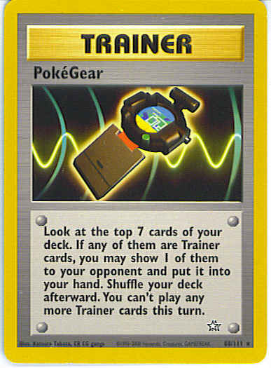 Look at the top 7 cards of your deck. If any of them are Trainer cards, you may show 1 of them to your opponent and put it into your hand. Shuffle your deck afterward. You can't play any more Trainer cards this turn.