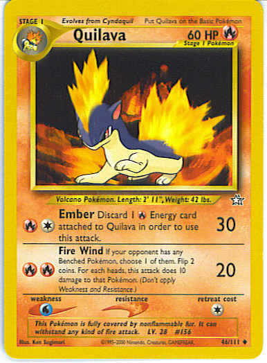 Type | Fire | Pokemon serie | Neo Genesis | Stadie | Stage 1 | HP | 60 | Sjældenhed | Uncommon | Tilbagetrækning | 1 | Svaghed | W | Kortnummer | 46 | Evne |