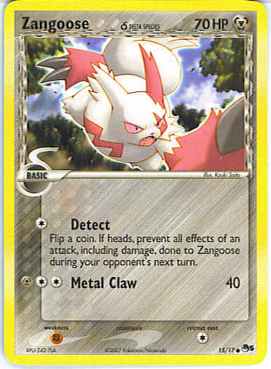 Type | Metal | Pokemon serie | OP Series 5 | Stadie | Basic | HP | 70 | Sjældenhed | Common | Tilbagetrækning | 1 | Svaghed | F | Kortnummer | 15 | Evne | [C] Detect - Flip a coin. If heads, prevent all effects of an attack, including damage, done to Zangoose during your opponent's next turn. [CCM] Metal Claw (40)