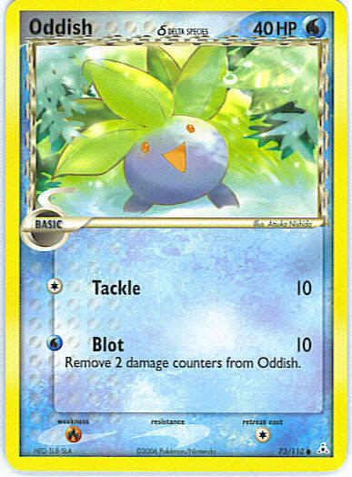 Type | Water | Pokemon serie | Holon Phantoms | Stadie | Basic | HP | 40 | Sjældenhed | Common | Tilbagetrækning | 1 | Svaghed | R | Kortnummer | 73 | Evne | [C] Tackle (10) [W] Blot (10) Remove 2 damage counters from Oddish. | Evne2 | [C] Tackle (10) [W] Blot (10) Remove 2 damage counters from Oddish. | Kunstner | Midori Harada |