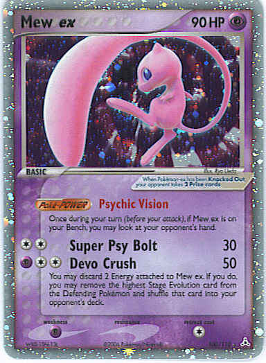 Type | Psychic | Pokemon serie | Holon Phantoms | Stadie | Basic | HP | 90 | Sjældenhed | Ultra-Rare | Tilbagetrækning | 2 | Svaghed | P | Kortnummer | 100 | Evne | [CC] Super Psy Bolt (30) [CCP] Devo Crush (50) You may discard 2 Energy attached to Mew ex. If you do, you may remove the highest Stage Evolution card from the Defending Pokemon and shuffle that card into your opponent's deck. | Evne2 | [CC] Super Psy Bolt (30) [CCP] Devo Crush (50) You may discard 2 Energy attached to Mew ex. If you do, you may remove the highest Stage Evolution card from the Defending Pokemon and shuffle that card into your opponent's deck. | Kunstner | Ryo Ueda |