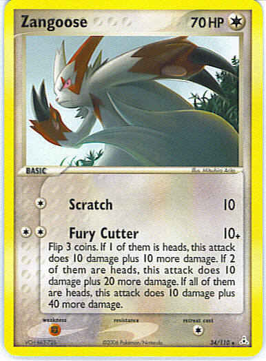 [CC] Fury Cutter (10+) Flip 3 coins. If 1 of them is heads, this attack does 10 damage plus 10 more damage. If 2 of them are heads, this attack does 10 damage plus 20 more damage. If all of them are heads, this attack does 10 damage plus 40 more damage.