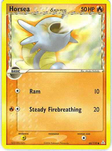 Type | Fire | Pokemon serie | Holon Phantoms | Stadie | Basic | HP | 50 | Sjældenhed | Common | Tilbagetrækning | 1 | Svaghed | L | Kortnummer | 66 | Evne | [C] Ram (10) [CR] Steady Firebreathing (20) | Evne2 | [C] Ram (10) [CR] Steady Firebreathing (20) | Kunstner | Sachiko Adachi |