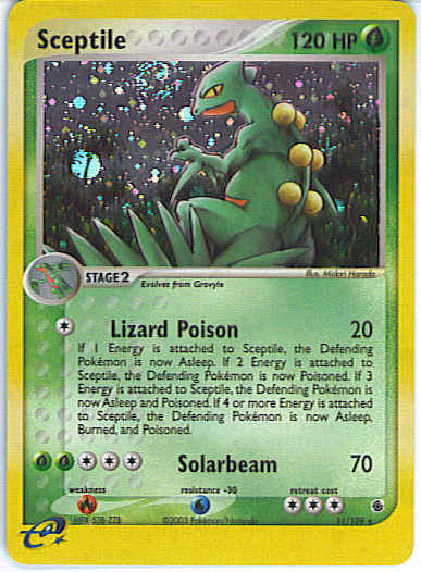 Type | Grass | Pokemon serie | Ruby Sapphire | Stadie | Stage 2 | HP | 120 | Sjældenhed | Rare | Tilbagetrækning | 3 | Modstand | W | Svaghed | R | Kortnummer | 11 | Evne | [C] Lizard Poison (20) If 1 Energy is attached to Sceptile, the Defending Pokemon is now Asleep. If 2 Energy is attached to Sceptile, the Defending Pokemon is now Poisoned. If 3 Energy is attached to Sceptile, the Defending Pokemon is now Asleep and Poisoned. If 4 or more Energy is attached to Sceptile, the Defending Pokemon is now Asleep, Burned, and Poisoned. [CCCGG] Solarbeam (70)