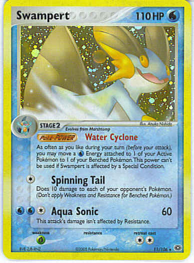 Type | Water | Pokemon serie | Emerald | Stadie | Stage 2 | HP | 110 | Sjældenhed | Rare | Tilbagetrækning | 2 | Svaghed | G | Kortnummer | 11 | Evne |