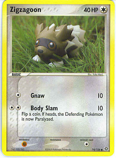 Type | Colorless | Pokemon serie | Emerald | Stadie | Basic | HP | 40 | Sjældenhed | Common | Tilbagetrækning | 1 | Svaghed | F | Kortnummer | 74 | Evne | [C] Gnaw (10) [CC] Body Slam (10) Flip a coin. If heads, the Defending Pokemon is now Paralyzed. | Evne2 | [C] Gnaw (10) [CC] Body Slam (10) Flip a coin. If heads, the Defending Pokemon is now Paralyzed. | Kunstner | Yuka Morii |